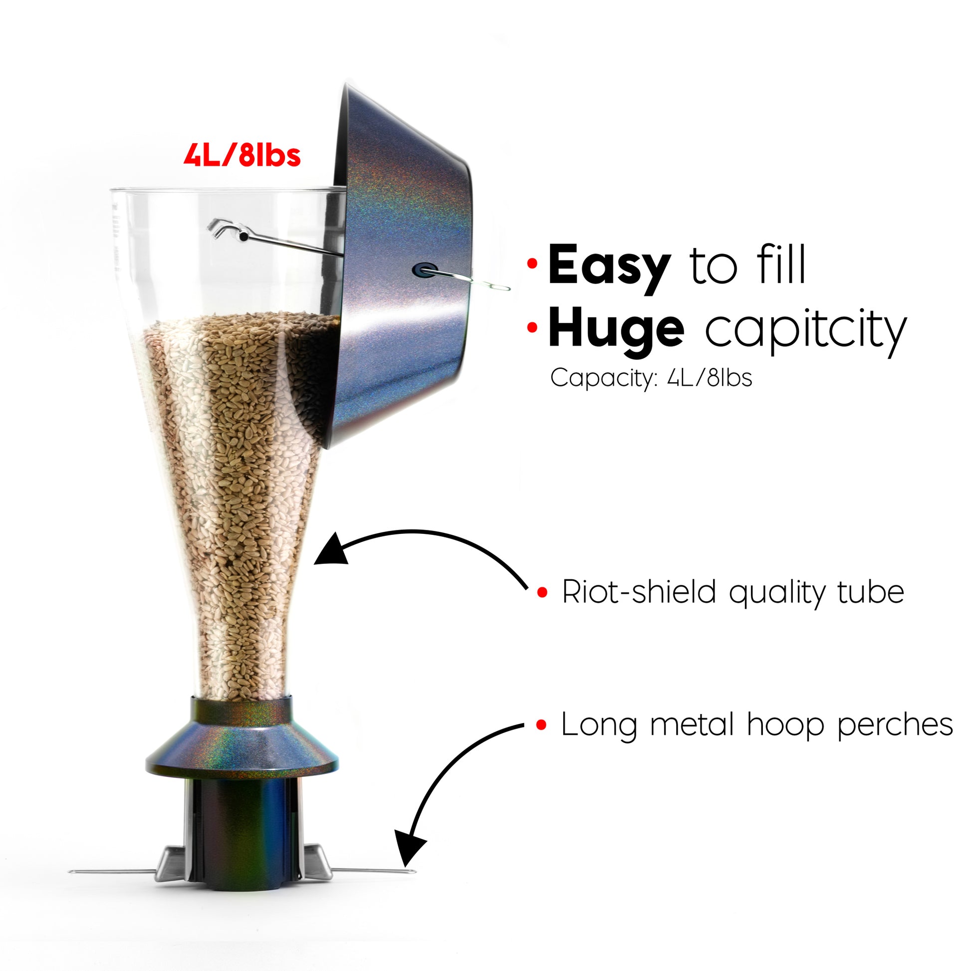 • Besiege Eichhörnchen, jedes Mal: ​​Sind Sie es leid, Ihr Vogelfutter an lästige Eichhörnchen zu verlieren? Das ausgeklügelte Design unseres Futterspenders stellt sicher, dass kein einziges Eichhörnchen an Ihren Samen gelangt.