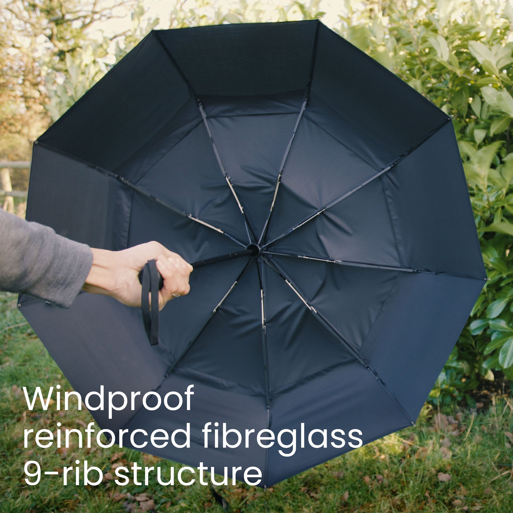 - Der dreifach verchromte schwarze Metallschaft und die verstärkte 9-Rippen-Struktur aus Fiberglas sorgen für deutlich höhere Stabilität bei starkem Wind. Der rutschfeste, gummierte Griff mit Trageschlaufe ermöglicht ein einfaches Tragen.