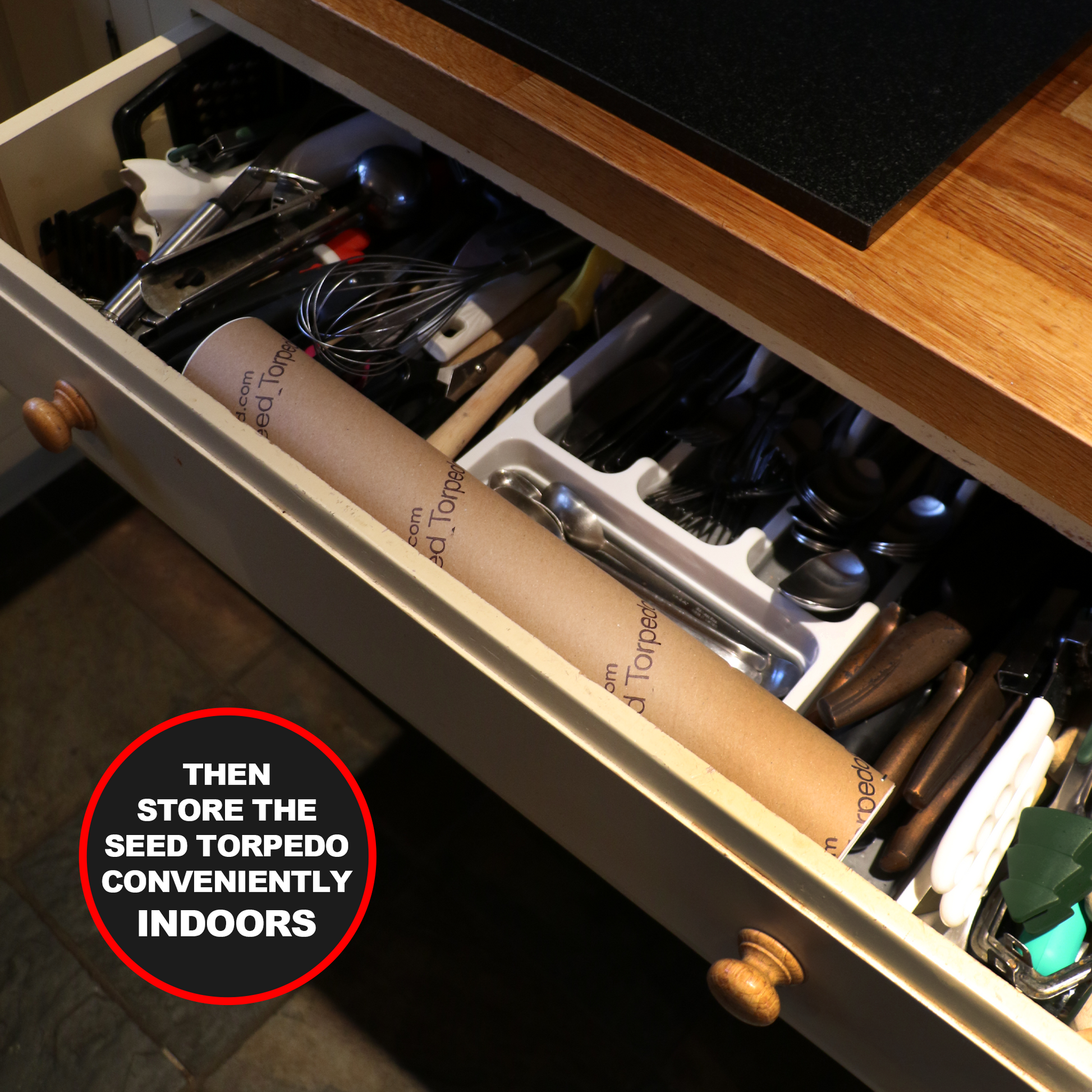 - Seed Torpedo can be stored in any drawer in your home, simply take it straight outside and fill your feeder instantly. The benefit of this is that you can fill your feeder quickly and easily no matter the weather & always keeps some seed in the house without having to go to the shed.